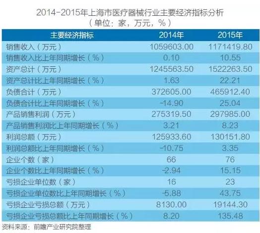 2015年上海市医疗器械行业的销售收入、资产总额和利润总额较上年均有不同程度的提升。根据国家统计局统计,2015年上海市医疗器械行业规模以上企业数量有76家,较上年增加10家;实现销售收入117.14亿元,同比增长10.55%;实现产品销售利润29.80亿元,同比增长8.23%;利润总计为13.02亿元,同比减少3.35%。(具体数据指标详见下表。)