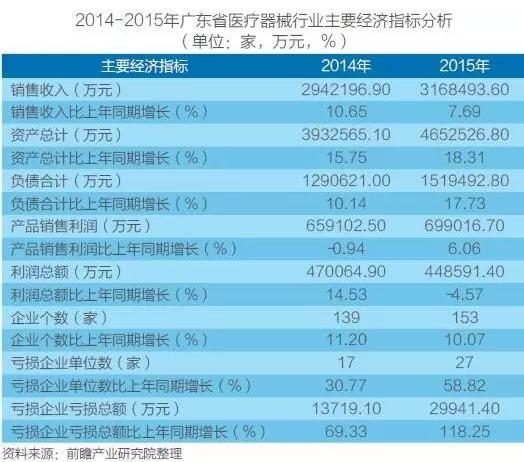 2015年,广东省医疗器械行业的销售收入和产品销售利润较上年均有所增长,利润总额有所下降。根据国家统计局统计,2015年广东省医疗器械行业规模以上企业数量有153家;实现销售收入316.85亿元,同比增长7.69%;实现产品销售利润69.90亿元,同比增长6.06%;利润总额为44.86亿元,同比下降4.57%。(具体数据指标详见下表。)
