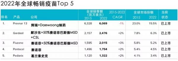 EvaluatePharma预测,到2022年,在全球最畅销的疫苗产品中,默沙东的HPV疫苗Gardasil将名列第二,销售额达到24.7亿美元,远远落后于沛儿的首要位置。赛诺菲的流感疫苗Fluzone以及用于白喉、破伤风、百日咳、小儿麻痹症和b型流感嗜血杆菌(DTaP/Hib/polio)的疫苗Pentacel将分列第三和第四位,GSK的白喉、破伤风、百日咳、乙型肝炎和脊髓灰质炎(DTP/hep B/polio)疫苗Pediarix预计将位列第五位。