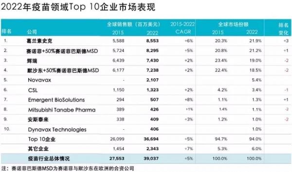 总体来看,到2022年,GSK、赛诺菲、辉瑞和默沙东预计将占疫苗市场80%的份额,这也证明,在这一行业展开竞争需要具备一定的规模实力。而包括诺华、CSL、Emergent BioSolutions、三菱田边、安斯泰来和Dynavax在内的一些小型疫苗生产商预计都将会处于下游位置。