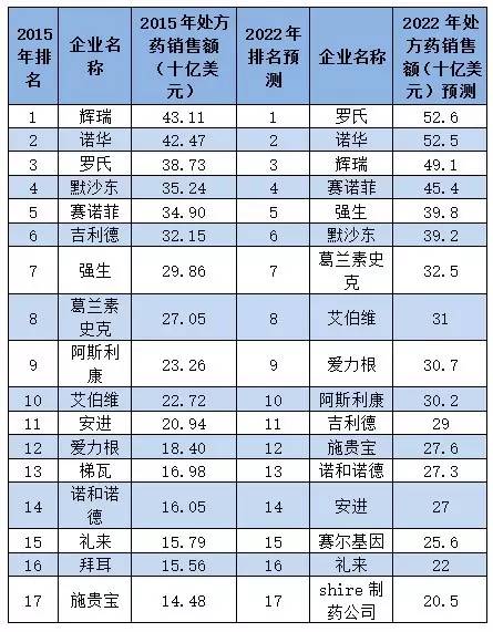 全球2015年处方药TOP20药企和2022年处方药TOP20药企预测