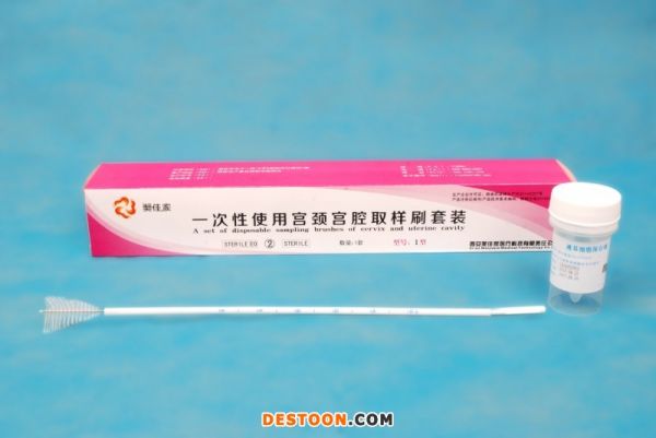 产品由取样刷组件(经环氧乙烷灭菌)和细胞保存液组件构成。一次性使用宫颈宫腔取样刷套装产品的特点是:① 操作简单,损伤小,可用于宫颈癌和子宫内膜癌的初筛;②可获取宫腔内细菌,用于细菌培养和药敏试验,指导治疗急性盆腔炎用药;③无菌包装;④ 一次性使用。