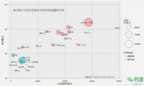 值得一提的是由于成熟市场国家和新兴市场国家的评分标准稍有不同,如果按照同一标准,新兴市场国家的评分会略微降低。为了更直观表现BCI评分排行,以及其是否与各国的经济发展水平和市场容量有什么关系,我们不妨拿这个评分数据做一张气泡图,以人均GDP作为考量各国经济发展水平的指标,以总GDP作为市场容量的指标,把这些数据放在一起直表现出来。