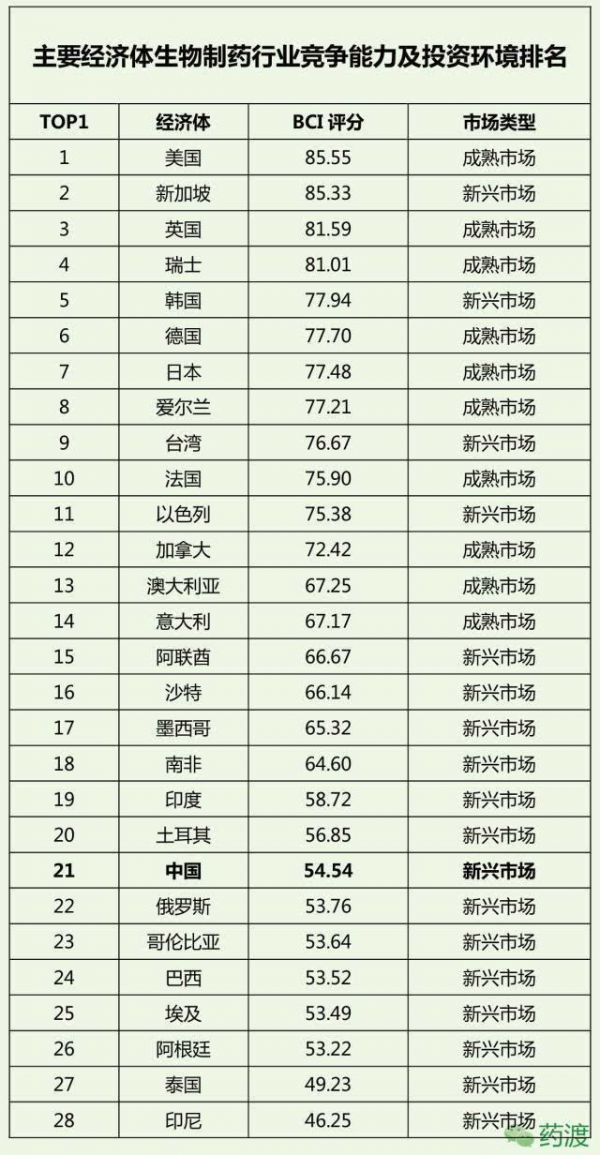 这项研究报告是从5个方面对世界各主要经济体的BCI进行评分,满分是100分。5个方面包括:科技实力及基础设施,知识产权保护情况,临床研究情况和框架体系,监管体系,市场准入及资金供应。他们的问卷的调查对象是各个国家生物制药公司的高层,这些人显然对生物制药的行情了解比较深入。问卷涉及到上述5个方面共计25个问题(考虑到经济历史的原因新兴市场和成熟市场问题略有不同),每个问题的答案分四个等级可供选择,他们就是根据这些答卷来对各国的BCI进行评分,得分排行榜如下:
