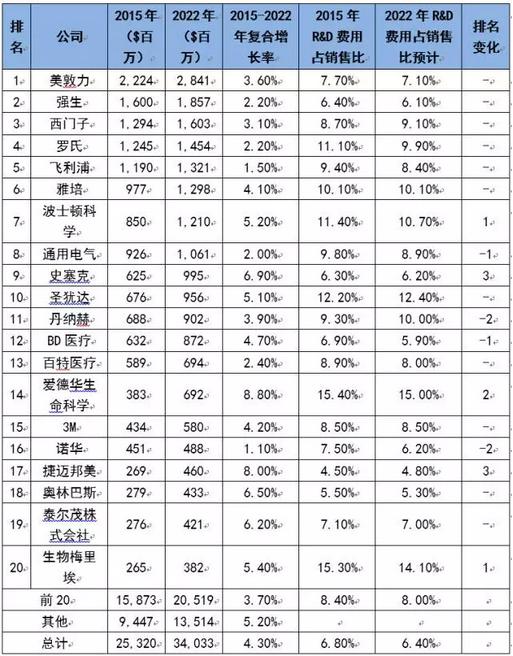 全球2015年和2022年医疗器械研发投入(R&D)TOP20企业对比