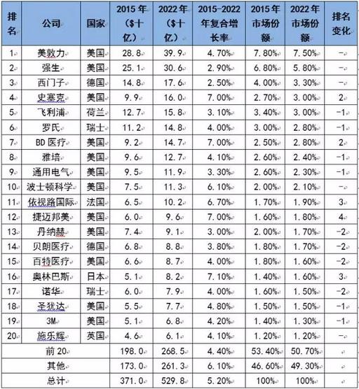 全球2015年TOP20医疗器械企业和2022年TOP20医疗器械企业预测