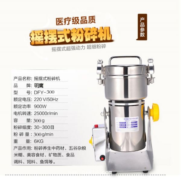 摇摆式粉碎机,批准文号:2014562348,医药招商企业广州市扬鹰医疗器械有限公司招商产品。适合干性物料。该机具有奖杯式和摇摆设计,方便对物料的倾倒和清理。摇摆式粉碎机招商详情请进入>>