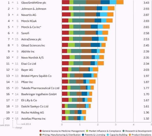 近日,2016 Access to Medicine Index榜单正式发布,自2008年该榜单发布以来,葛兰素史克(GSK)连续5次蝉联榜首。今年发布的榜单中紧随GSK之后的是强生(Johnson & Johnson)、诺华(Novartis)和默克(Merck KGaA)。该榜单主要选取包括药品管理、市场影响、研发能力、药品定价、制造与销售、专利与许可、规模增长、捐赠等多个指标评价来对国际制药公司进行综合评价。