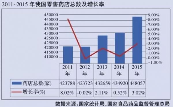 截至2015年底,我国的药店总数(包括连锁门店和单体药店)为448057家,同比增长3.02%。在GDP持续增长、社会消费水平提高、人口老龄化、城镇化以及消费结构升级等因素的驱动下,我国医药零售市场仍存在较大发展空间。