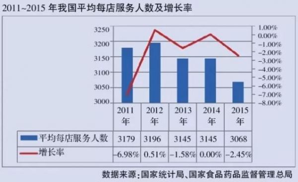 据每年年末人口总数计算,每年平均每店服务人数均在3000人以上,但呈现持续下滑的态势,表明中国零售药店生存竞争激烈。