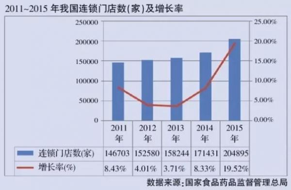 2015年,我国药品连锁企业为4981家,同比增长16.76%,连锁门店数为204895家,增长19.52%,增长率创近年新高。