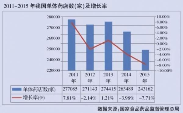 截至2015年底,我国单体药店数量锐减至243162家,下跌7.71%,出现近九年来最大跌幅。