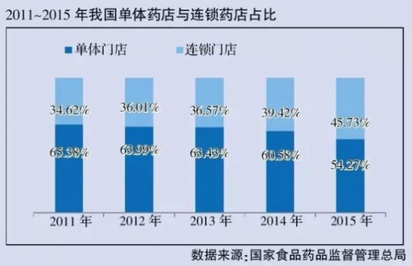 2015年,我国药店结构变化较大,单体药店占比首次跌破60%,连锁门店数占比上升6.31个百分点,提升至45.73%,说明我国连锁药店的集中度不断上升。