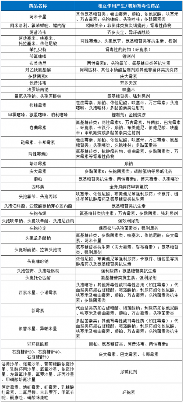表2:药物联合使用产生/增加肾毒性的药品对照表
