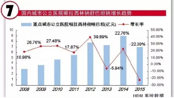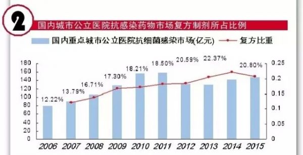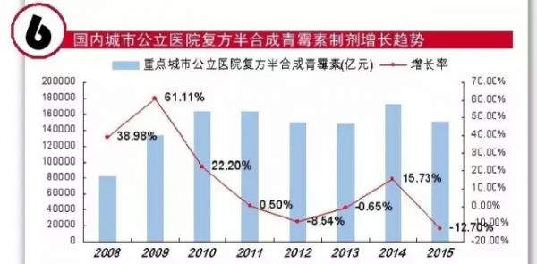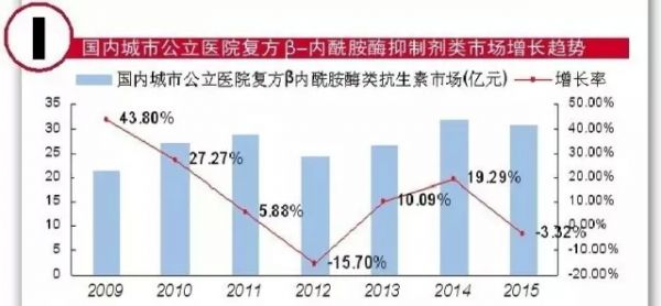 据 CFDA南方医药经济研究所标点信息公司“中国城市公立医院化学药终端监测分析系统(下称HDM系统)数据显示,2015年,国内重点城市公立医院全身抗菌药物中,11只复方半合成青霉素制剂和10只复方头孢类制剂购药金额达到30.83亿元,同比上一年下降了3.32%。