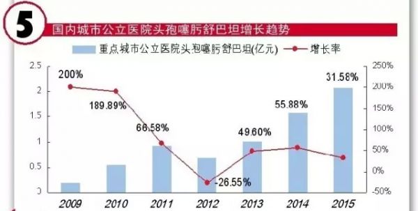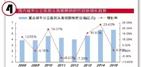 迄今为止,国内头孢哌酮钠舒巴坦钠是头孢抗生素市场居首位药物。根据HDM系统数据分析,2015年国内重点城市公立医院头孢哌酮舒巴坦增长率略低,仅为0.30%,用药金额为5.81亿元。而增长率最高的是头孢噻肟舒巴坦,重点城市公立医院头孢噻肟舒巴坦用药市场2.08亿元,增长率近32%,在临床抗菌用药中独当一面,国内市场将近40亿元规模。