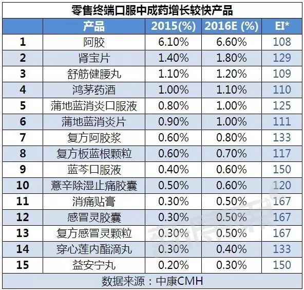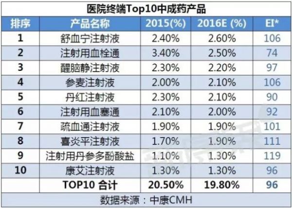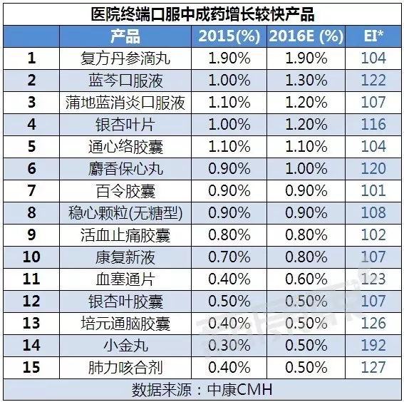 根据中康资讯《中国医药行业六大终端用药报告蓝皮书》,2015年六大终端中成药规模达3478亿元,占总体药品市场份额25.2%,同比增长7.7%。但受中药注射液不景气和中药原料监管等影响,2016年中成药增速将有所放缓,预计为4.9%。