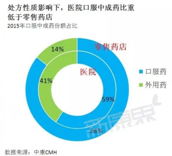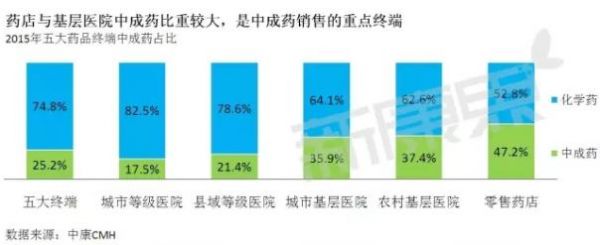 零售药店和基层医院用药结构中,中成药占比相对较高。在药品处方性质的影响下,医院终端中成药注射液比重较大,零售终端则以口服用药为主。