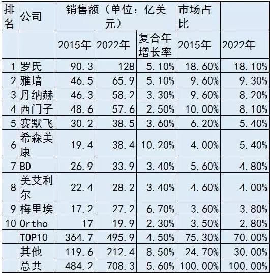 罗氏在IVD领域继续占据优势,2015年销售额为90亿美元,与第二位的雅培差距巨大,2022年销售额预计达到128亿美元。丹纳赫、西门子、赛默飞分别排在第三、四、五名。