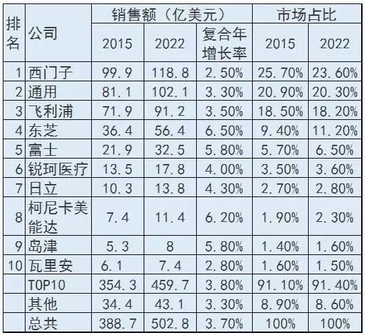 报告预测影像市场的增长速度最慢,预计只有3.7%。西门子将维持其第一的地位,通用紧跟其后。