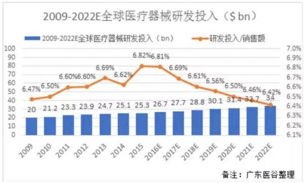 2009-2022,全球医械领域研发总投入变化情况,单位:十亿美元