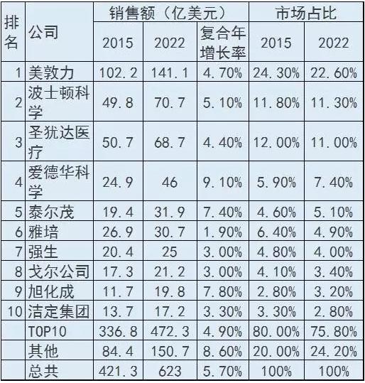 美敦力以399亿美元依然占据首位,强生306亿美元紧随其后,西门子、史赛克和飞利浦将分别占据第三至第五位。