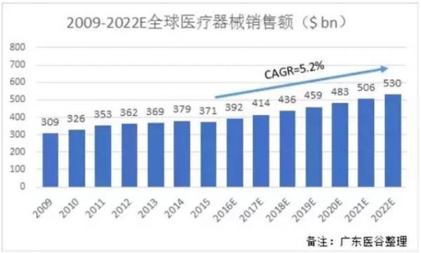来看看,从市场销售额、研发投入等不同角度,谁才会是未来全球医疗器械市场的霸主?未来最有前景的医疗器械市场又有哪些? 以下为相关主要预测一览: 一、2022年医疗器械市场哪些领域最有前景 报告指出,2015年全球医械市场销售为3,710亿美元,相较2014年的3,787亿美元,下降2%。预计2022年全球医械市场销售额将会达到5,298亿美元,CAGR(复合年增长率)为5.2%。