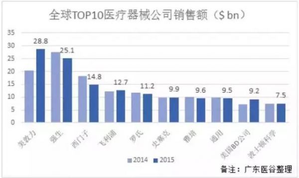 美敦力超越强生成为2015年全球医械市场霸主,年销售额达到288亿美元,市场份额由2014年5.3%升至7.8%,这得益于2015年以429亿美元收购柯惠医疗。强生以251亿美元退居次席,市场份额也由2014年7.3%降至6.8%。西门子、飞利浦和罗氏分列第三至第五位。