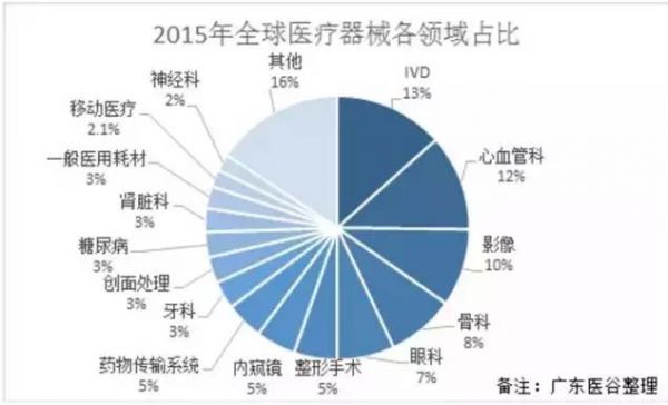 2009-2022,全球医械市场销售总额变化情况,单位:十亿美元。 从具体领域来看,TOP15医疗器械种类2015年销售额达3,137亿美元,市场份额为84.5%。预计2022年TOP15全球销售额可达4,468亿美元。 备注:此处的TOP15医疗器械种类,销售额占比从高到低,依次为IVD、心血管科、影像、骨科、眼科、整形手术、内窥镜、药物传输系统、牙科、创面处理、糖尿病、肾脏科、一般医用耗材、移动医疗、神经科。