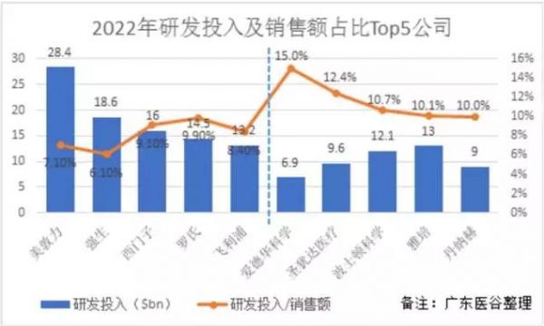 2022年,医械巨头研发投入金额,及研发占销售比重情况。单位:亿美元。