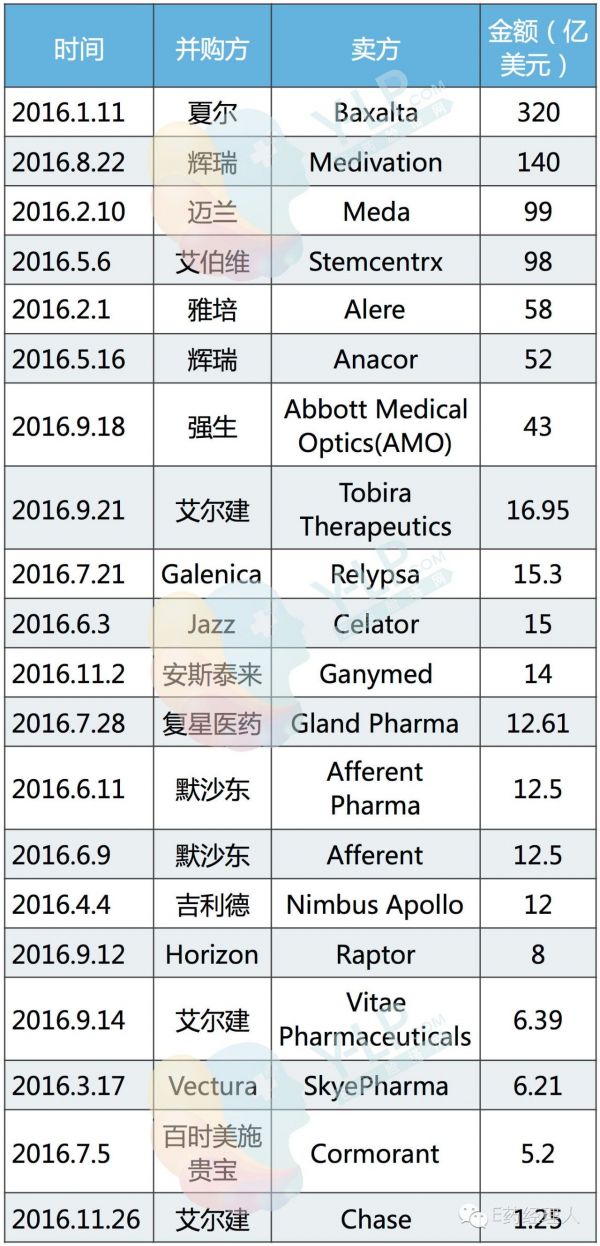 夏尔爱情长跑终抱得Baxalta归、辉瑞艾尔建世纪并购告吹、辉瑞虎口夺食从赛诺菲手中抢下Medivation……2016年全球药企并购,料依然足。今年仅药企对药企的过亿并购案例,总金额就高达947亿美元。夏尔的头单金额即领衔全年,而以量取胜者莫过于失意后不停买买买的艾尔建。值得一提的是,这次的表单里跻入了中国企业的身影。