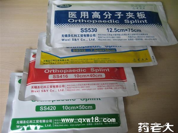 能避免使用其他绷带长期局部包扎造成的因透气性差所至的皮肤潮热、瘙痒和刺激,而利于皮肤的呼吸、除汗、解痒、消肿、减少感染发炎,给病人舒爽的感觉。4、透X射线:不用拆除即可拍X光片且非常清晰;,有利于接骨和确定受伤状态, 便于观察治疗效果。5、操作简便:医生不用戴手套,操作和塑型更方便,拆除更简单。 6、舒适性:高分子夹板固化后收缩性小,不会产生石膏变干后使皮肤发紧、发痒、发热烧灼感的不适感觉。 夹板内侧厚层无纺棉抗菌除臭,外面绑定的纱布可自行解除,洗澡冲凉擦干后再绑定夹板,便利舒适更人性化。 7、安全:除掉外绑定的纱布即可拿掉夹板,无须电动石膏锯切割,患者更安全。 8、规格多样:适用于不同部位、方便选择。