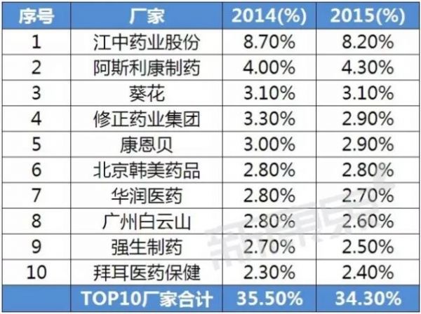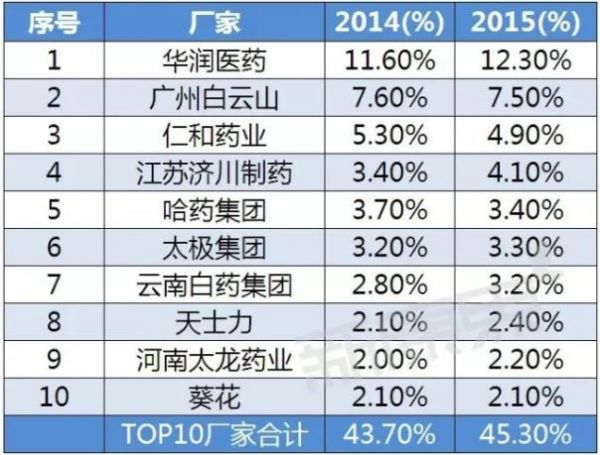 表2 2015年零售市场感冒药TOP10厂家销售额份额