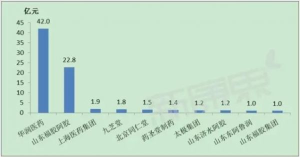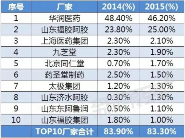 2015年,零售市场补益养生类TOP10厂家累计销售额为75.8亿元,销售额份额合计约为83.3%,市场集中度与2014年相比有所下滑。在补益养生类市场中,TOP10厂家被内资企业包揽,华润医药和山东福胶阿胶市场份额高达71.2%,优势极其显著,其中,阿胶为补益养生类畅销单品。
