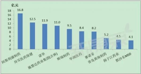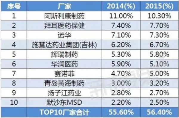 2015年,零售市场降血压药TOP10厂家累计销售额为92.1亿元,销售额份额合计约为56.4%。市场集中度与2014年相比有所提高,其中,钙通道阻滞剂和作用于肾素-血管紧张素系统的药物是降压药主要细分品类。在降血压药市场中,外资企业霸主地位优势显著,TOP4被外资企业全数包揽。阿斯利康制药蝉联降血压药销售额第一,2015年销售额份额为10.3%,较2014年下滑0.7%。