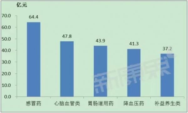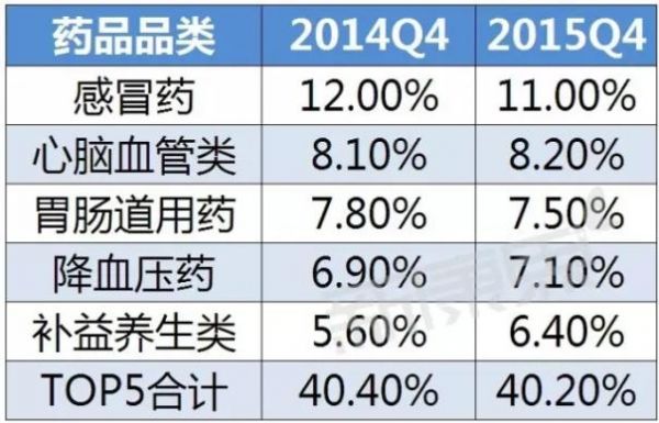 据中康CMH监测数据显示,2015年第四季度零售药店最畅销药品品类销售额TOP5的累计销售规模为234.5亿元,市场份额为40.2%,与2014年同期相比,市场集中度有所下滑。其中,销售规模最高的仍是感冒药,达到64.4亿元,销售额份额为11.0%,在高基数的影响下,增速仅有2.0%,低于同期零售药店总体11.4%%的增速。
