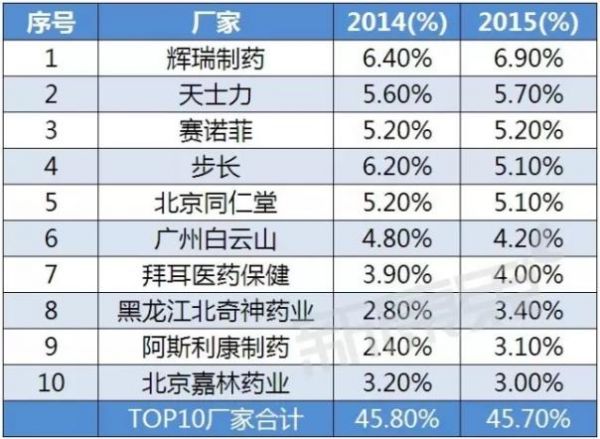 表6 2015年零售市场补益养生类TOP10厂家销售额份额