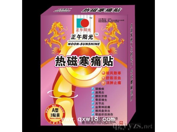 热磁寒痛贴,批准文号:鄂食药监械(准)字2014第2261086号,医药招商企业武汉正午阳光医药生物科技有限公司招商产品,该产品适用于因颈椎病、肩周炎、腰肌劳损、骨质增生、关节炎、坐骨神经痛、椎间盘突出、软组织扭挫伤等所致的各种疼痛.热磁寒痛贴招商详情请进入>>