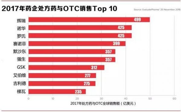 ● 辉瑞(Pfizer)依旧牢牢占据制药行业老大地位,2017年其全球处方药与OTC的销售额预计接近500亿美元;