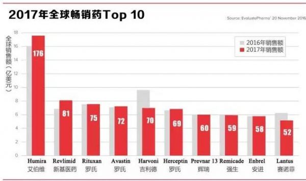 与此同时,诺华旗下山德士(Sandoz)的依那西普(Enbrel)生物类似药已经获得FDA批准,但安进(Amgen)仍在通过专利法庭延阻其上市。此外,罗氏的三大畅销产品利妥昔单抗(Rituxan)、贝伐单抗(Avastin)与曲妥珠单抗(Herceptin)将分列2017年全球畅销药Top 10榜的第3、4、6位,其均将在接下来几年内面临生物类似药的竞争。