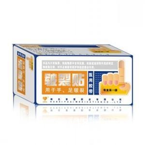 皲裂贴产品说明:【用法用量】:揭开防粘纸贴于手、足患处。注意事项:1.患处有湿烂渗液及化脓者禁用。2.对橡胶膏过敏者忌用。3.有手足癣,脚湿气,湿疹,汗疱疹并伴有手足皲裂者,应于治疗原有疾病的同时在医师指导下使用本药。4.使用一周后症状无改善,或裂隙宽深,活动出血者,应去医院就诊。5.患处皲裂疼痛,在用本药的同时疼痛加剧,流脓渗液伴发热恶寒,患处附近的淋巴结肿痛等表现,应去医院就诊。6.对本品过敏者禁用,过敏体质者慎用。