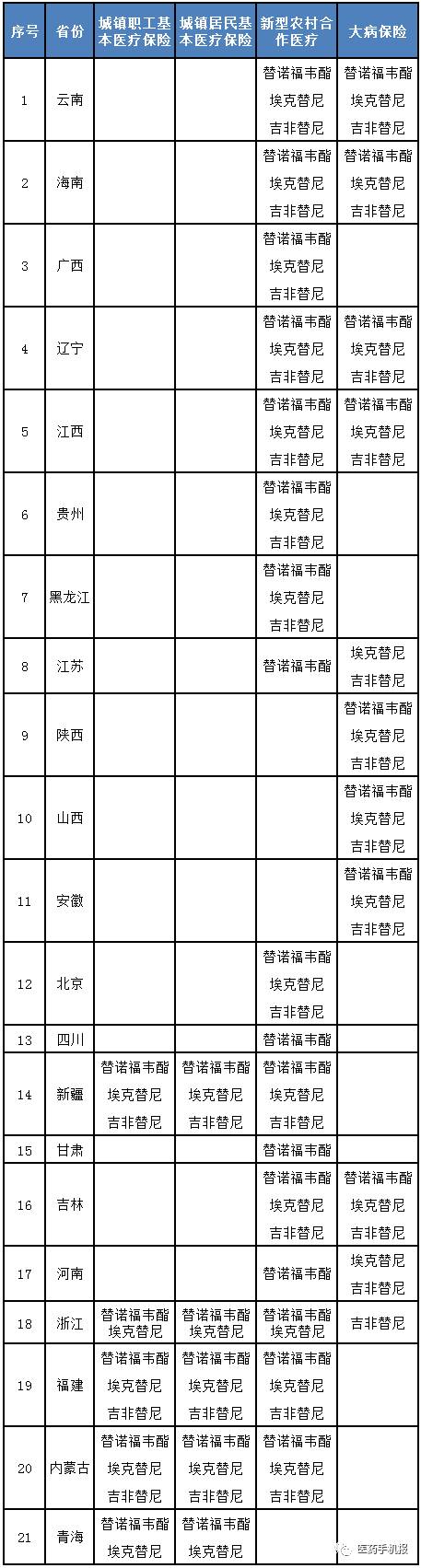 国家卫计委发布《各地将谈判药品纳入各类医保合规费用范围的进展情况(2016年11月29日)》,截至11月29日,有21个省份将谈判药品纳入各类医保合规费用范围。