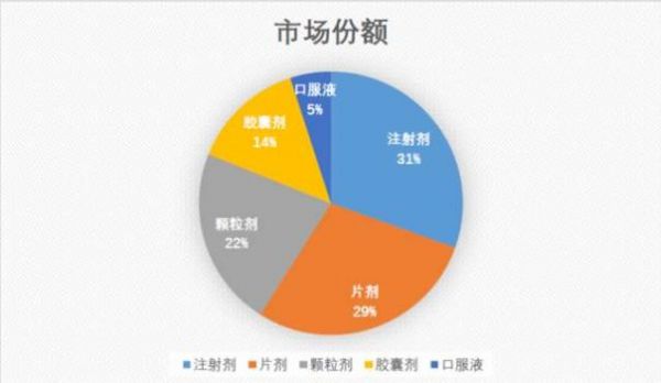 就拿占比最高的感冒药来说,又可以细分成注射剂、片剂、颗粒剂、胶囊剂和口服液,每一类都有着不错的市场份额。