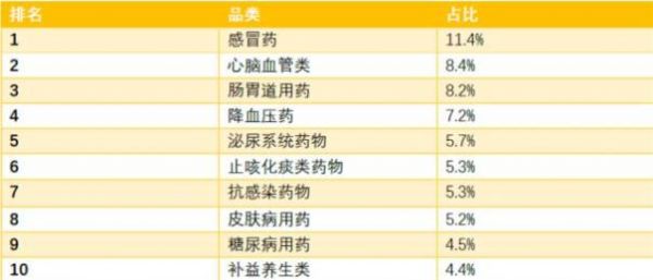 中康CMH统计的去年零售药品销量前10的品类基本上都是一些些常用药。