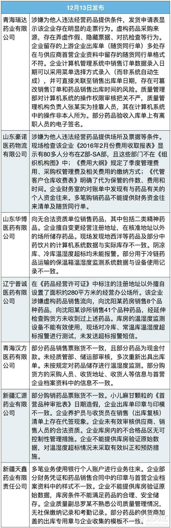 12月13日,CFDA发布总局关于青海瑞达药业有限公司等药品批发企业检查结果的通告,这是在CFDA发布《关于整治药品流通领域违法经营行为的公告》(2016年第94号)后,CFDA第二次通告药品批发企业违法经营行为情况。两次共有23家药品批发企业存在严重违法行为,被立案查处。