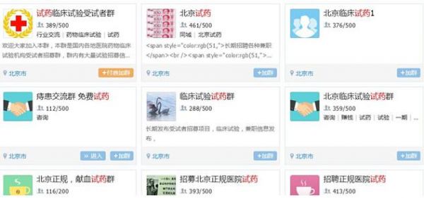 “郑州试药群”、“试药之家”、“苏州试药”……在QQ群检索工具栏里输入“试药”字样,一堆各种名头的试药群让人眼花缭乱。在微信里搜索,也会找到北京、上海等地一些知名医院招募试药人的公众号。