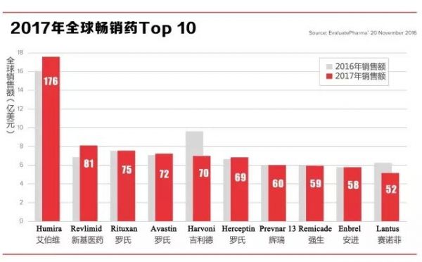 与此同时,诺华旗下山德士(Sandoz)的依那西普(Enbrel)生物类似药已经获得FDA批准,但安进(Amgen)仍在通过专利法庭延阻其上市。此外,罗氏的三大畅销产品利妥昔单抗(Rituxan)、贝伐单抗(Avastin)与曲妥珠单抗(Herceptin)将分列2017年全球畅销药Top 10榜的第3、4、6位,其均将在接下来几年内面临生物类似药的竞争。