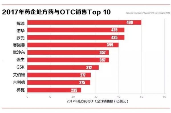 ● 辉瑞(Pfizer)依旧牢牢占据制药行业老大地位,2017年其全球处方药与OTC的销售额预计接近500亿美元;