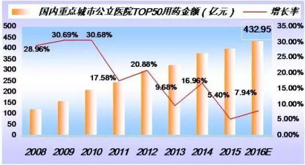 据HDM系统数据,2016年重点城市公立医院用药TOP 50药物均为超过5亿元人民币的品种,TOP 50药物总金额已达433亿元。另据米内网智能版“国内城市公立医院、县级公立医院、社区卫生中心、乡镇卫生院(简称四大终端)”数据,TOP 50药物市场超过了3000亿元。2017年TOP 50药物增长率将高于总体平均值,表现出持续增长趋势,城市公立医院、县级公立医院、社区卫生中心、乡镇卫生院四大终端有望达到3500亿元,仍是市场重要动力。