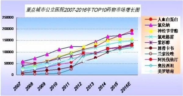 据HDM系统数据,2016年重点城市公立医院TOP 10药物用药金额为143.66亿元,同比上一年增长7.95%。居于首位的是人血白蛋白,随后依次是氯化钠、神经节苷酯、氯吡格雷、紫杉醇、恩替卡韦、兰索拉唑、阿托伐他汀、奥拉西坦和美罗培南。国内四大终端已超过1000亿元的市场规模。